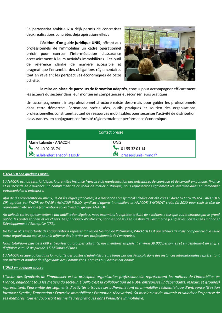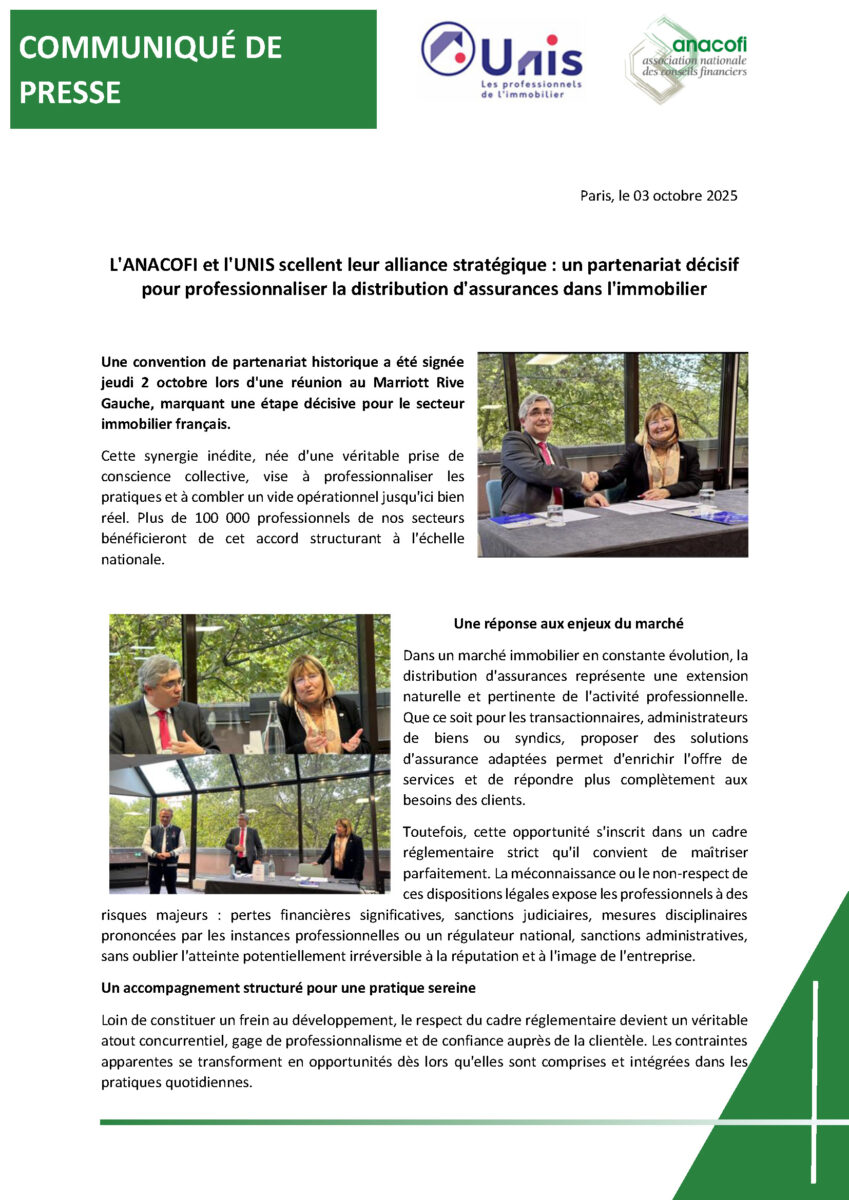 Communiqué de presse L’ANACOFI et l’UNIS scellent leur alliance stratégique
